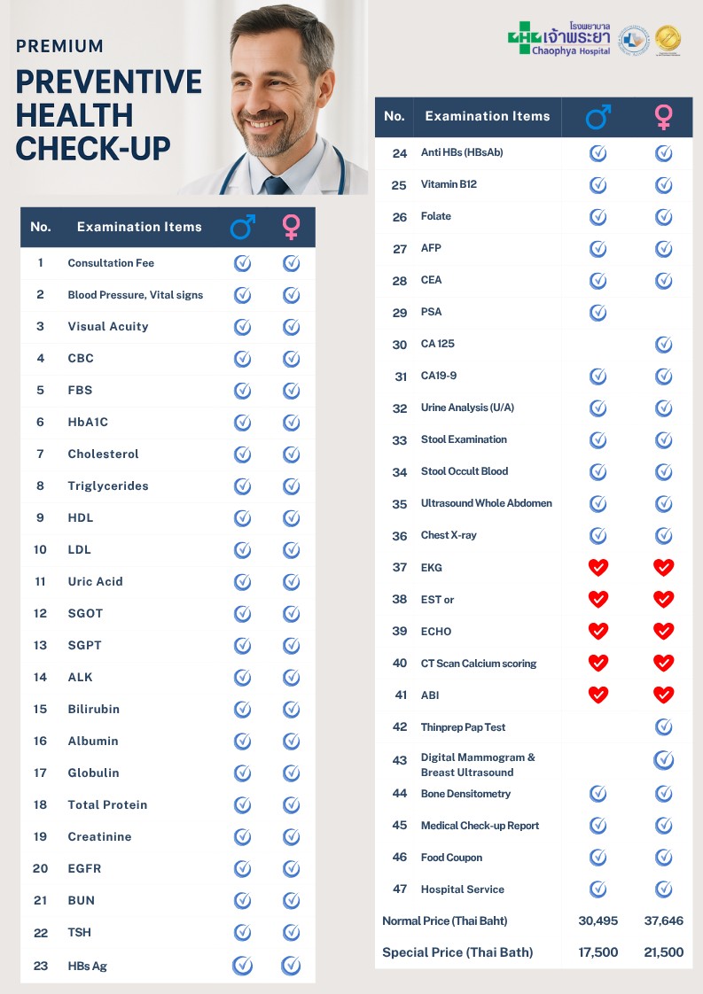 Chaophya Hospital Checkup Center provides one-stop health checkup service by virtue of its linkage to the clinical laboratory’s analyzers by the Laboratory Information Computer System and to the Radiology Imaging Center by the PACS (pictures archive communication system. Test results flow directly from the laboratory and imaging center allowing for error free, rapid tests reporting at the same visit. The Checkup Center offers multiple standard packaged health checkup programs suitable for persons in different age groups and conditions at economical price.
